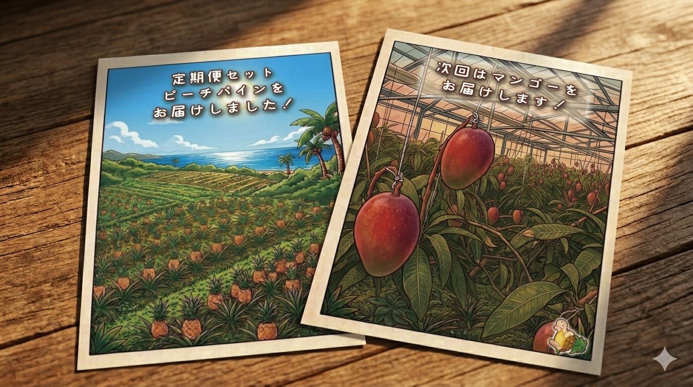 先にお届けしますピーチパインに、後日マンゴーをお届けする旨を